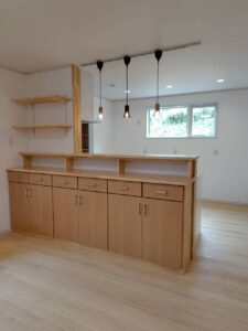 食器棚など収納たっぷり/リビングの一部に作業台も付けました。